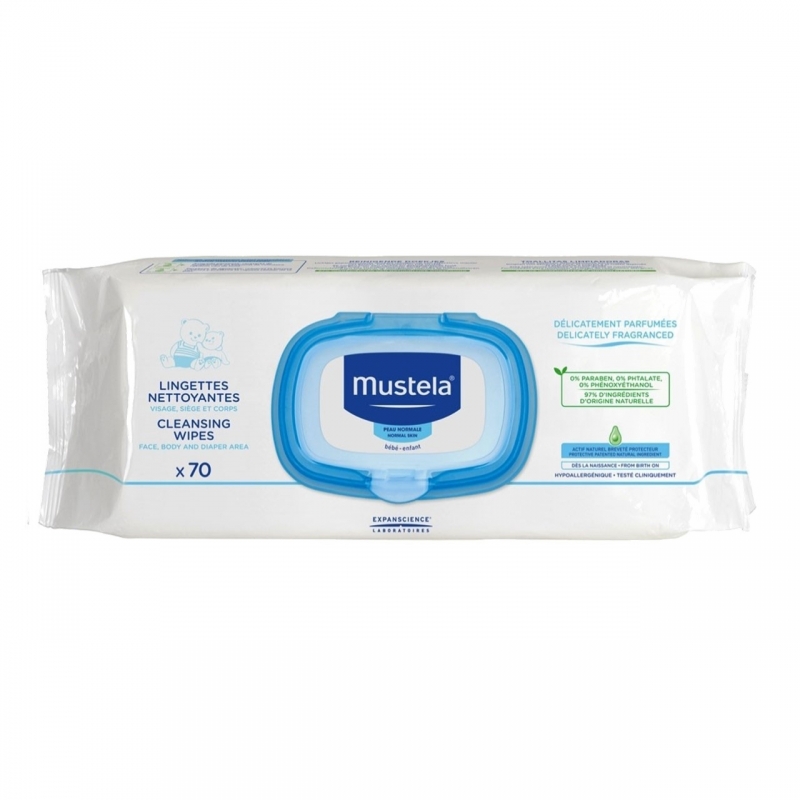 Вологі серветки для тіла та обличчя Mustela Bébé - ідеальний засіб для очищення ніжної шкіри дитини як вдома, так і в дорозі .