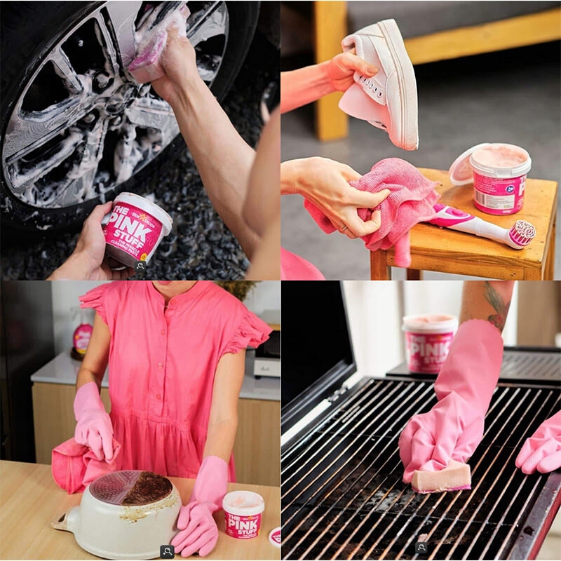 Pink Stuff м’який до поверхонь, але видаляє стійкі плями і може використовуватися для чищення кухонного посуду, стільниць, раковин, керамічної плитки, скла та багато іншого.
