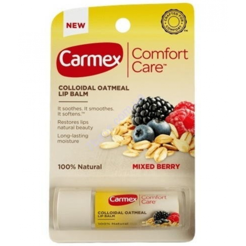 Бренд Carmex представив Comfort Care Lip Balm Mixed Berry – стик для губ «Ягідний мікс». Ідеально опрацьований коктейль з колоїдної (дрібно подрібненої) вівсянки, олій капукаку та з плодового насіння, а також бджолиного воску. Засіб має потужні поживні та зволожуючі властивості, допомагає забезпечити якісний і турботливий догляд делікатній шкірі.