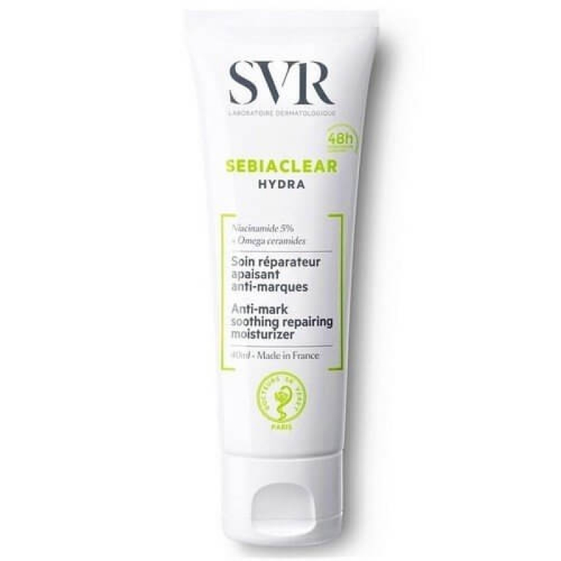 Покращує гідратацію, ліквідує нерівності та дефекти жирної, проблемної шкіри, яка стала пересушеною і подразненою після дерматологічного лікування висипань. Засіб для обличчя: масляна фаза 21%, водна фаза 77%, матуючі пігменти 2%. Фізіологічний рН. Консистенція легка, добре поглинається, має приємний аромат. Випускається в тубах об'ємом 40 мл. Діючі інгредієнти у кремі SVR Sebiaclear Hydra ефективно заспокоюють вогнища запалення, матують, вирівнюють колір шкіри, видаляють залишкові висипання, шрами і плями.