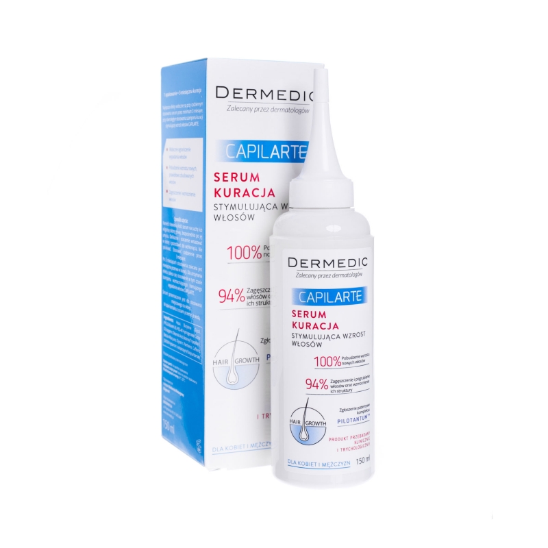 Сироватка Dermedic Capilarte, що стимулює та відновлює ріст волосся, призначена для лікування передчасного випадання волосся різної етіології, у тому числі гормональної та генетичної, як у жінок, так і у чоловіків.