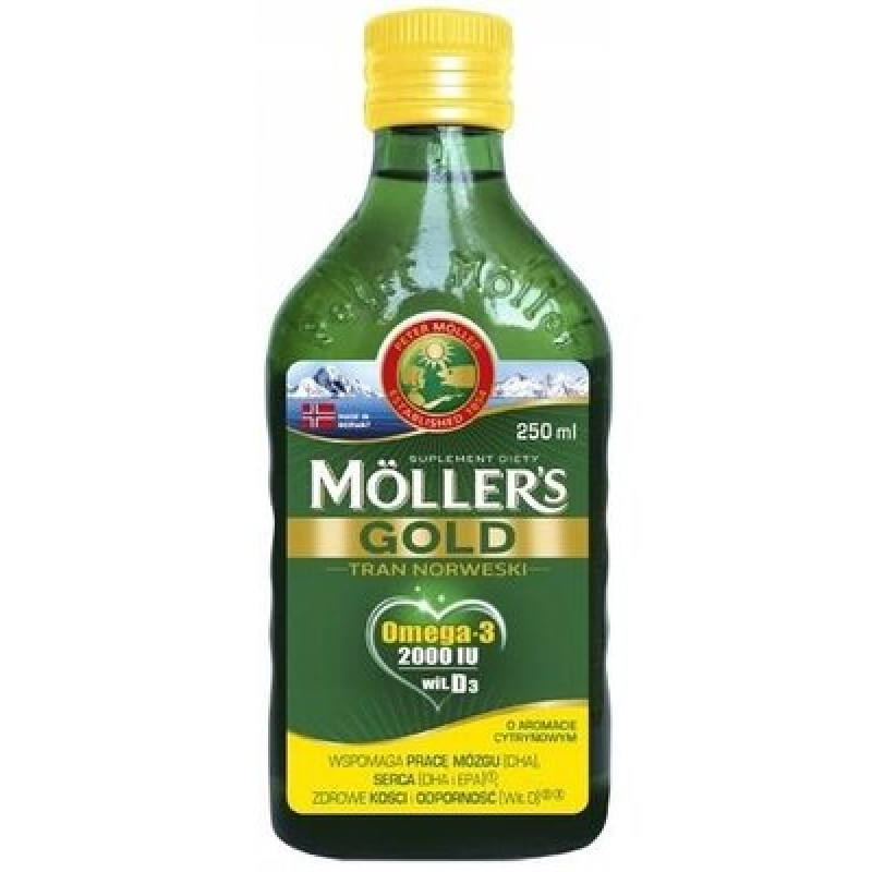 Mollers Gold - це комбінація високоякісної олії печінки тріски, багатої Омега-3 DHA та EPA, з вітаміном D3. Омега-3 DHA сприяє нормальній функції мозку та правильному зору. Омега-3 DHA та EPA сприяють нормальній функції серця. Вітамін D підтримує здоров'я кісток та зубів. Вітамін D та A підтримують імунітет. Вітамін А сприяє нормальному зору.